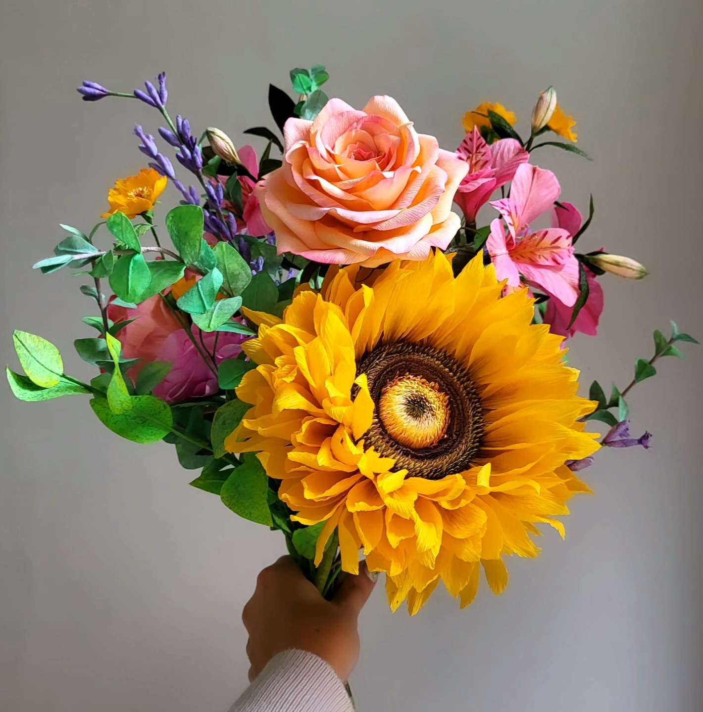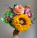 Handmade Paper Flower Bouquet – Sunflower, Roses, Dahlias & Wildflowers (Flat-Back Bridal Design)