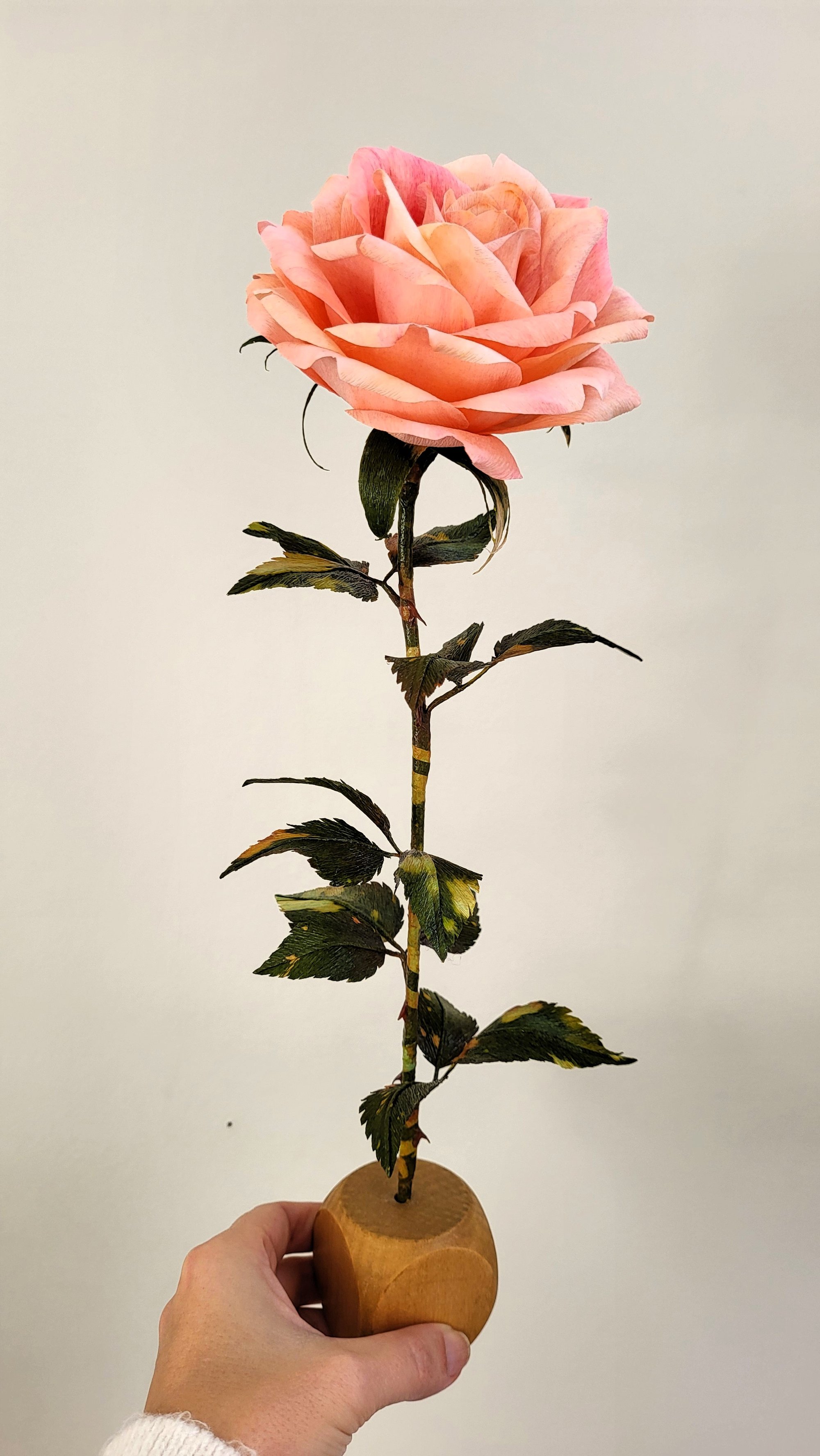 Each stem is hand-wrapped and paired with textured leaves for an organic, realistic finish. To make displaying it effortless, this rose comes with its own wooden stand, allowing you to showcase it on a desk, shelf, or bedside table with ease.